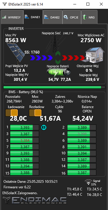 Zakładka DANE1 ,2 ,3 wyświetla aktualne dane z falownika Solarnego oraz modułu BMS , informacje takie jak: