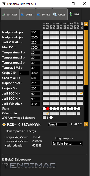 – Zakładka NRG to konfiguracja wyjść w zależności od poszczególnych wymagań użytkownika oraz statusu falownika oraz BMSa