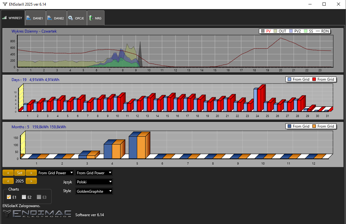 W zakładce WYKRESY wyświetlane są informacje o zużyciu energii elektrycznej w danym momencie oraz wykresy zużycia dniowego miesięcznego oraz rocznego.