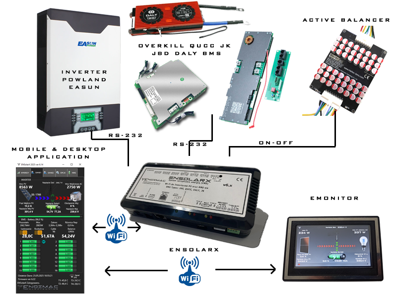 Urządzenie ENSolarX obsługuje Hybrydowe Falowniki Solarne Marek Easun, Powland,DEYE, Sunsynk, Growatt, Sofar PowMr oraz wiele innych oraz BMS-y firmy QUCC, JBD, ANT, DALY, JK, SEPLOS, PYLONTECH (maksymalna ilość cell 16)