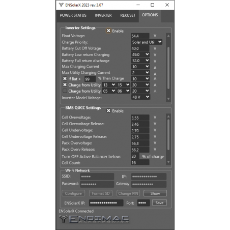 Zakładka OPTIONS to konfiguracja ustawień, parametrów pracy falownika Solarnego oraz modułu BMS.